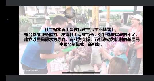 第二部分王老师重点介绍了社工站建设的政策背景、社工站的基本定位以及区级社工站、街道社工站的功能。社工站的建设,一可以整合基层服务能力;二可以推动专业社会服务的发展;三可以弥补基层民政的不足。社工站实质上是在民政主责主业基础上,整合基层服务能力、发挥社工专业特长、弥补基层民政的不足,建立以居民需求为导向、专业为支撑、五社联动为机制的基层民生服务新模式、新机制。