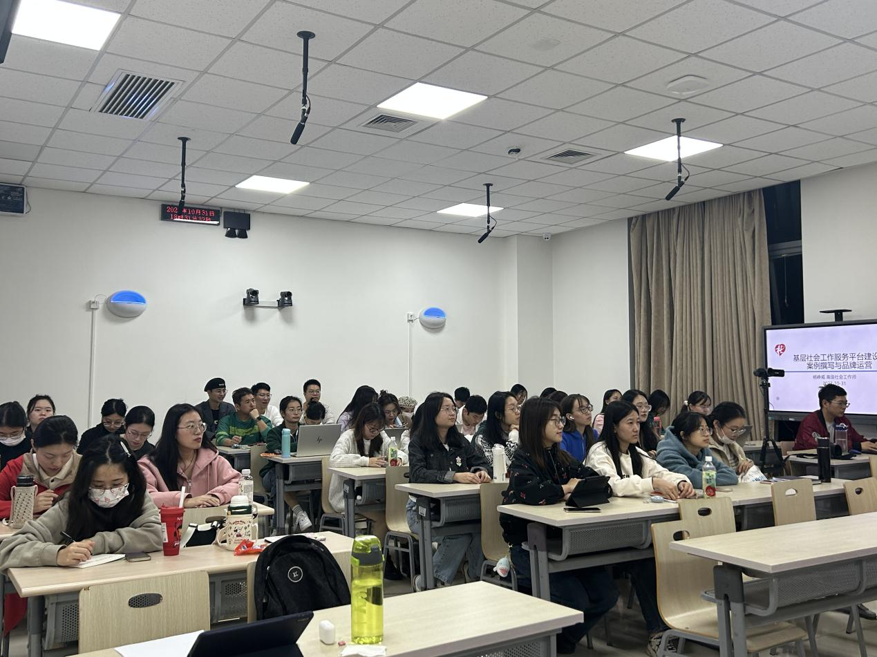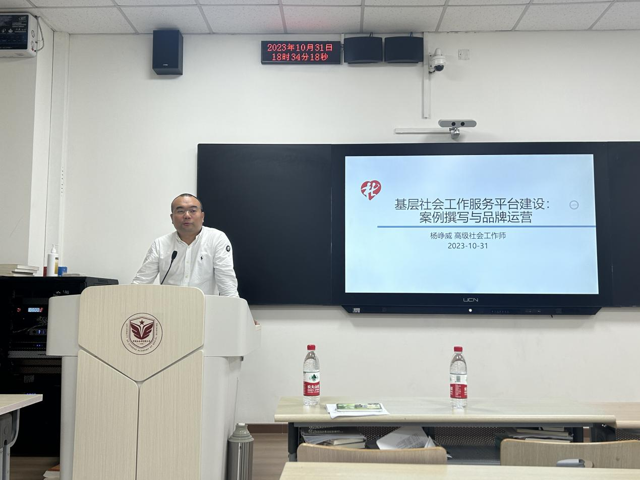 2023年10月31日晚上6:30,由304am永利集团主办,老年学与社区研究中心承办的社会工作硕士实务大讲堂顺利开展。本次讲座邀请到高级社会工作师杨峥威老师为社会工作专业的员工开展主题为“基层社会工作服务平台建设:案例撰写与品牌运营”的讲座。杨峥威老师有着丰富的实务经验,特别是在建设基层社会工作服务平台方面颇有建树,杨老师围绕基层社会工作服务平台概述、社会工作服务案例撰写、社工中心(站)特色品牌建设与运营三个方面为同学们进行分享。