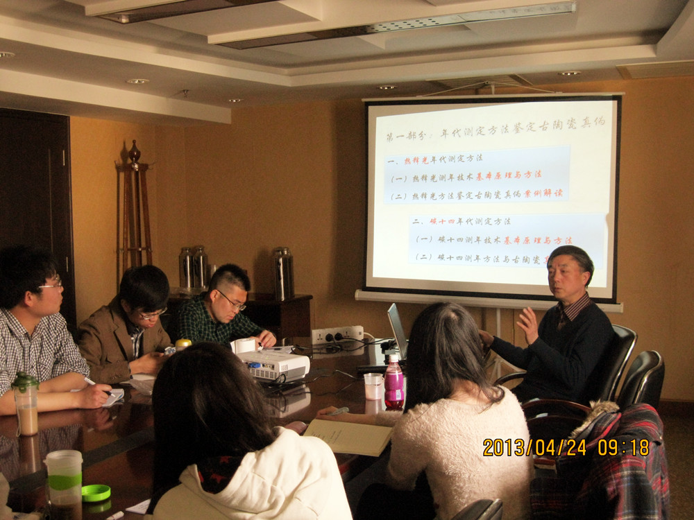 4月24日,故宫博物院科技部主任苗建民研究馆员在中国社科院近代史所会议室给文博中心陶瓷专业的同学们讲解了古陶瓷鉴定中的科技鉴定方法,详细讲解了热释光技术的原理以及在陶瓷鉴定上的著名案例。