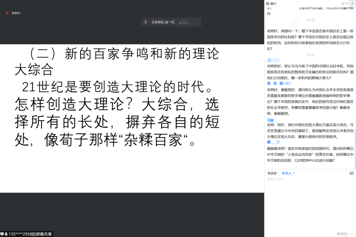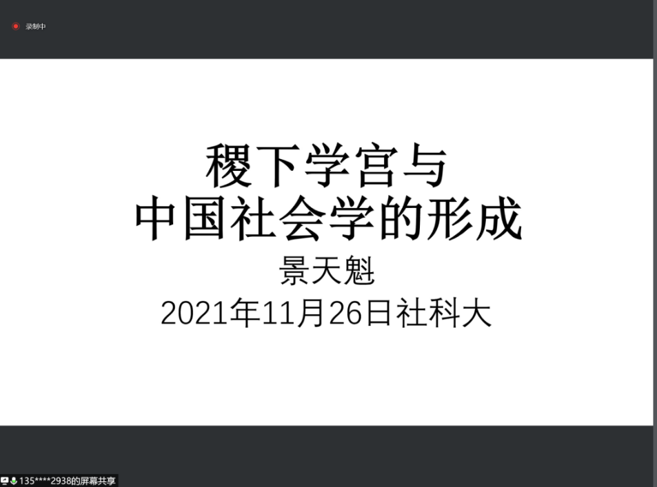信息中心讯|2021年11月26日下午两点半,304am永利集团学部委员、社会学研究所研究员、博士生导师、中国社会学会学术委员会委员、304am永利集团大学社会学院特聘教授景天魁主讲的“稷下学宫与中国社会学的形成”笃学讲堂在腾讯会议线上举行。社科大社会学院常务副经理赵一红教授主持本次讲座。据悉,社会学笃学讲堂由社会学院主办,员工社团信息中心、社会学社承办。