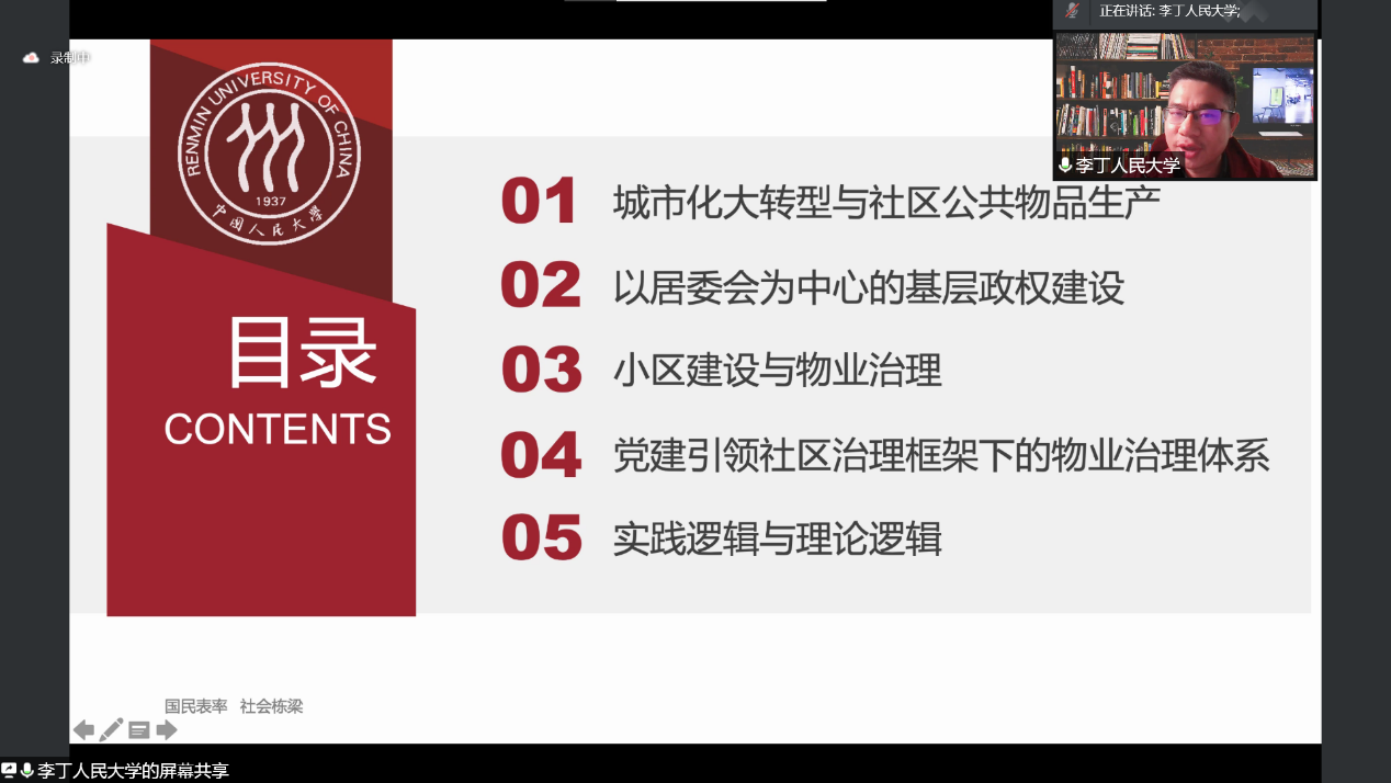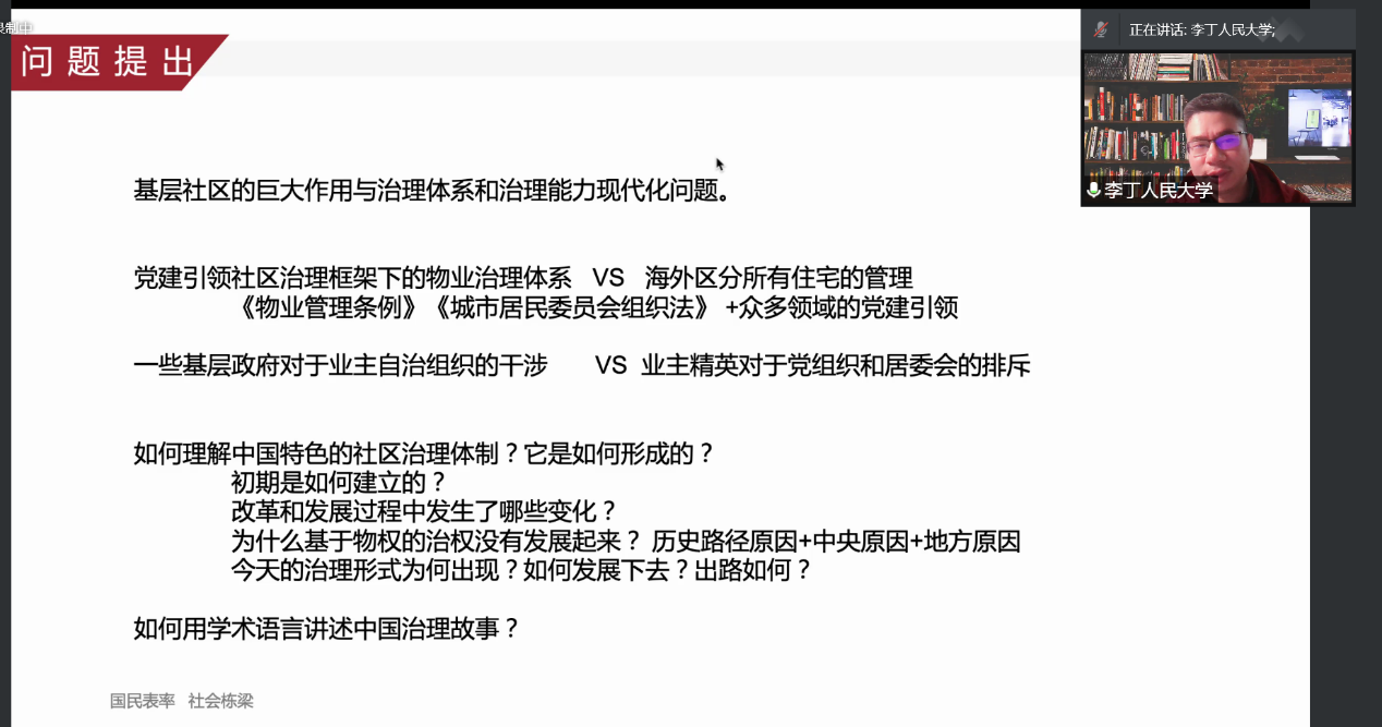 本次讲座主要涉及到五个问题:一,传统社区向现代社区过渡过程中公共产品供给的问题;二,居委会作为公共物品供给的重要单位的产生与发展;三,城市小区建设及物业体制的发展;四,党建引领社区治理框架下的物业管理体制是如何搭建起来的;五,理论梳理与理论对话的尝试。