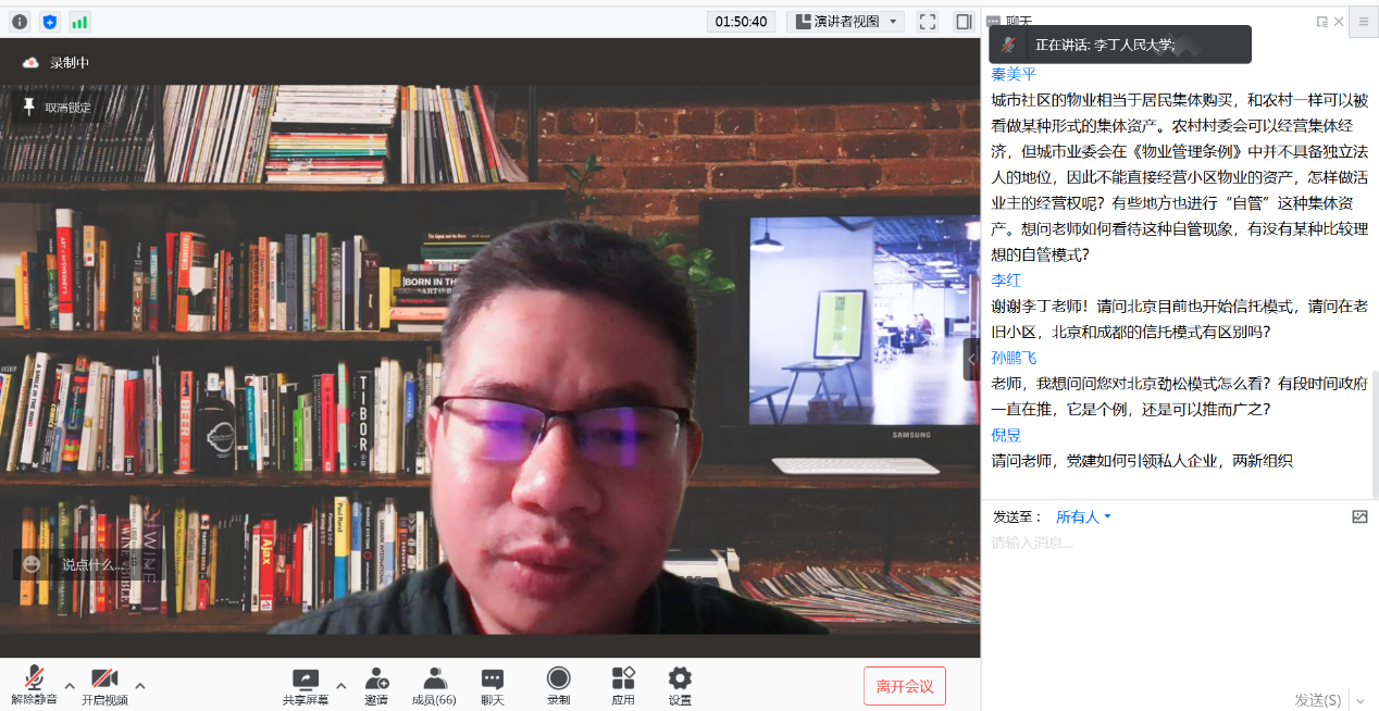 李老师认为,业主的集体行动并不是在尝试争取地方的政治权利,而更接近一种经济经营的行为。我们应该参考农村集体经济的思路,在党建引领之下,将社区公有土地作为一种集体资产,确立共有产权,每个业主入股。在业主正式地组成应该经济法人的前提下,物业公司也应该走向市场化。同时组织起来的业主也能够自费自力承担一部分社区维护的职能。这种尝试是我党超越私有制理想的体现,也是社区建设应该坚持党建引领的原因。