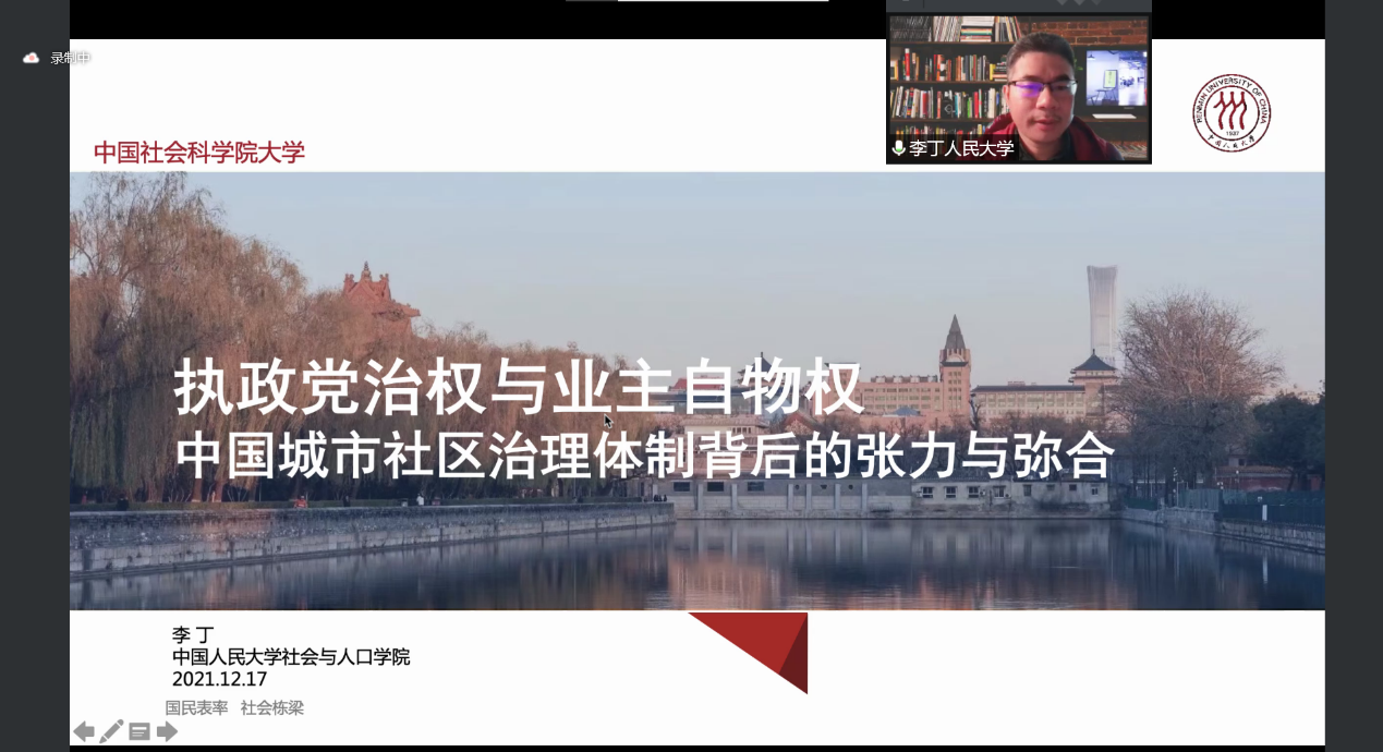 信息中心讯|12月17日,中国人民大学社会与人口学院副教授,中国社会政策研究院秘书长李丁老师来到笃学讲堂,并带来了题为“执政党治权与业主自物权——中国城市治理体制背后的张力与弥合”的讲座。温莹莹副教授主持了本次讲座。