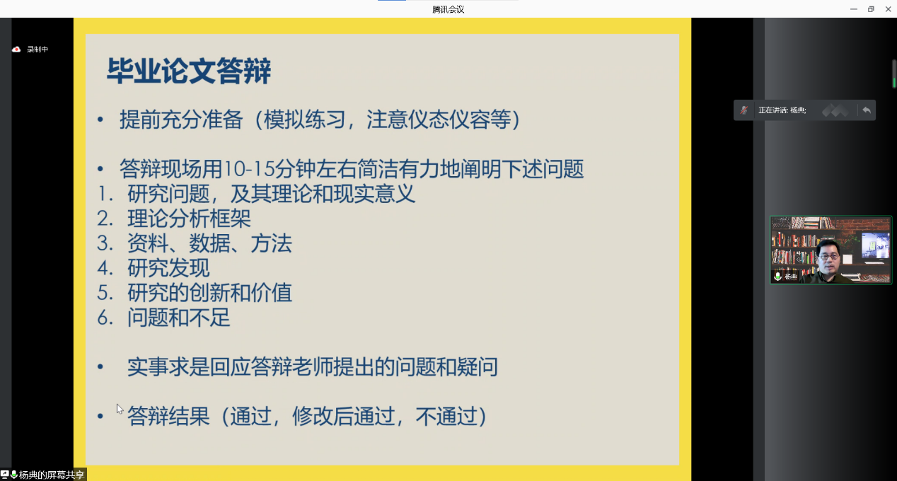 最后,杨典老师介绍了学士学位论文的重要性,对论文写作内容要求进行了说明,并对答辩当中的注意事项进行了讲解。