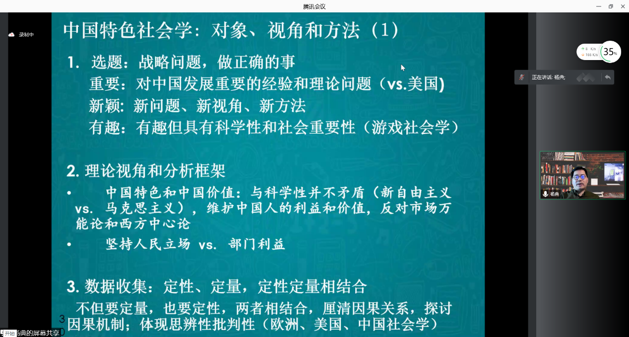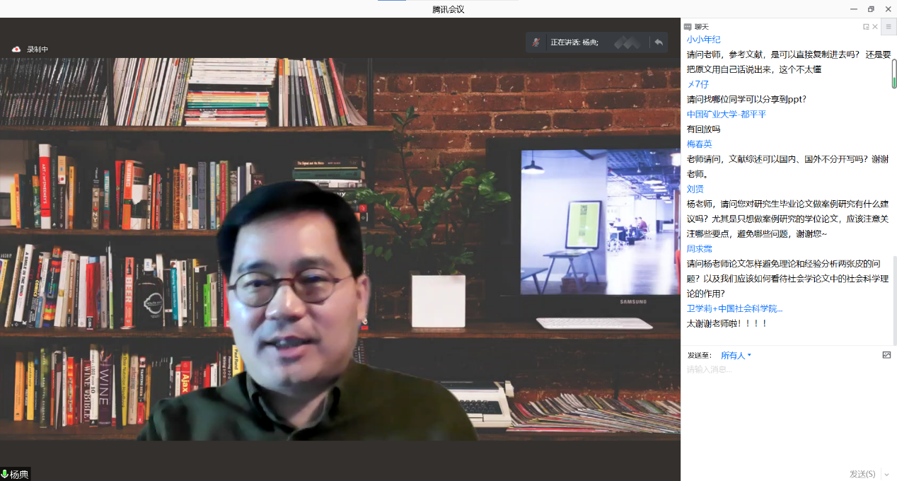 此外,在论文写作的一般经验外,杨典老师针对中国特色社会学的对象、视角与方法进行经验讲解。在选题方面,要提出对中国发展重要的经验和理论问题,注意新问题、新视角、新方法,可以是有趣但具有科学性和社会重要性的视角。在理论视角和分析框架上,要有中国特色和中国价值,维护中国人的利益和价值,坚持人民立场,反对市场万能论和西方中心论,立足于中国的重大社会问题与独特经验。在数据收集上,要注意定性、定量以及定性定量相结合的方法选择,厘清因果关系,探讨因果机制。