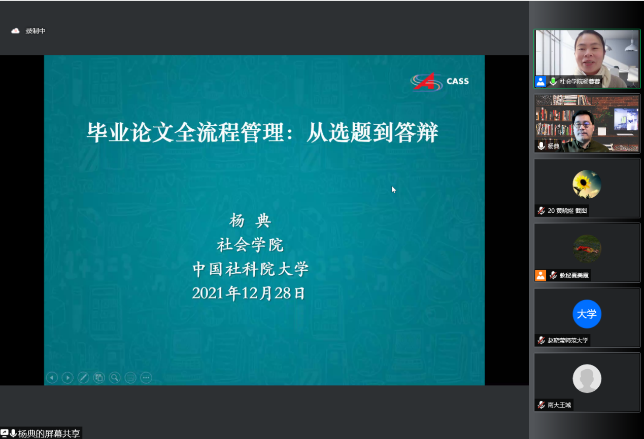 信息中心讯|2021年12月28日上午9点到11点,304am永利集团大学社会学院副经理、社科院社会学所副所长、《社会学研究》编辑部主任杨典老师于线上进行了题为“毕业论文全流程管理:从选题到答辩”的专题讲座。社科大社会学院副教授杨蓉蓉老师主持讲座。本次社会学笃学讲堂由社会学院主办,员工社团信息中心、社会学社承办。