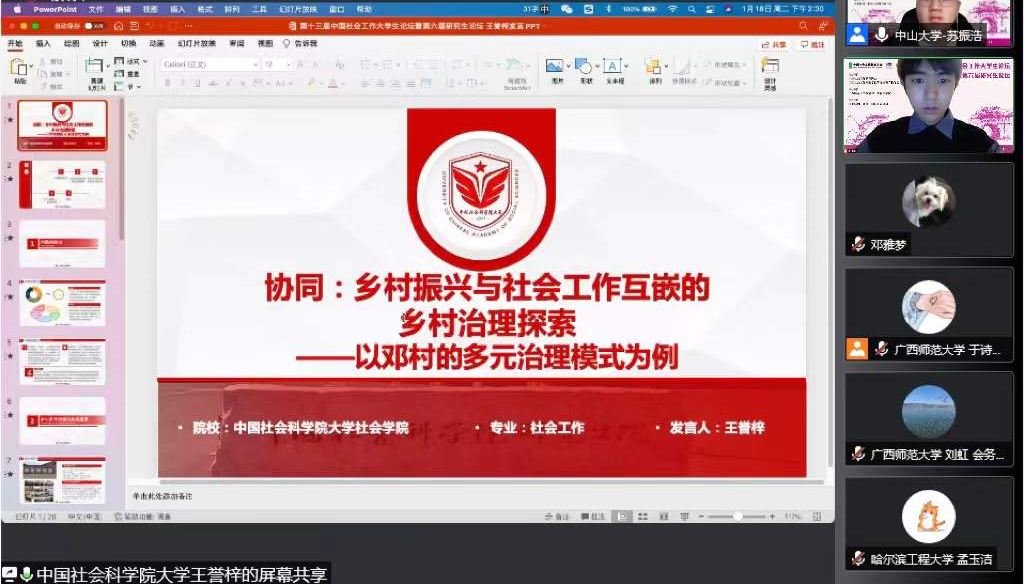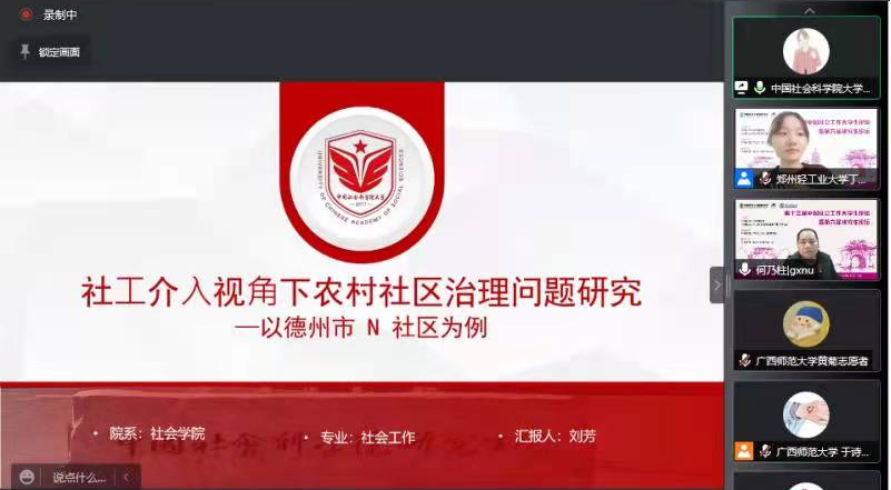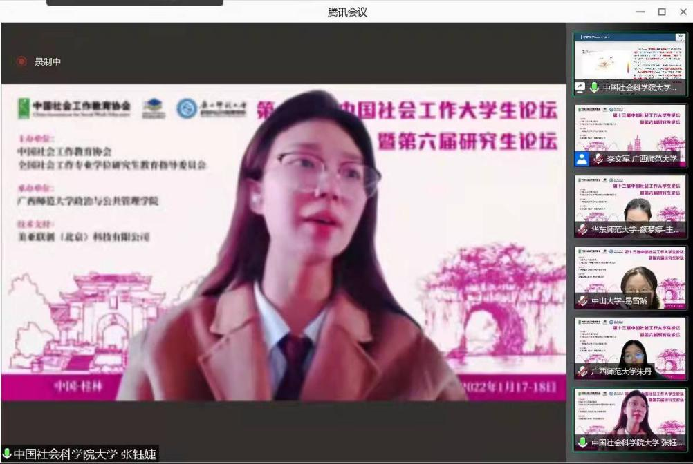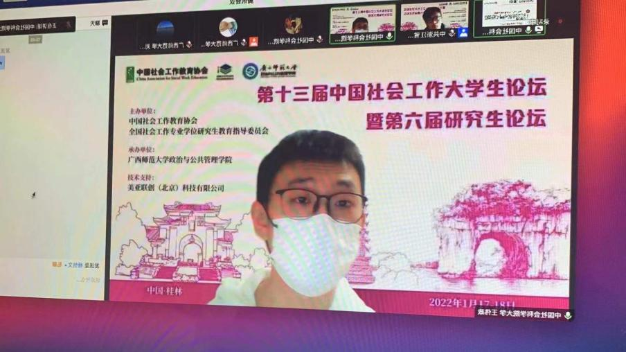 2022年1月17日—18日,公司2021级社会工作硕士研究生刘芳、王伟政、王誉梓、张钰婕四名同学参加了由中国社会工作教育协会、全国社会工作专业学位研究生教育指导委员会主办,广西师范大学承办的“第十三届中国社会工作老员工论坛暨第六届研究生论坛”,广西师范大学林春逸教授,中国社会工作教育协会王思斌教授、关信平教授、彭华民教授、顾东辉教授出席会议。来自北京大学、南京大学、复旦大学、南开大学、中国人民大学等全国各地300多所高校近400名本硕博社会工作专业师生齐聚云端,参与这场学术的“饕餮盛宴”。在此次论坛中,张钰婕同学获得了硕士组二等奖,刘芳、王伟政、王誉梓同学获得了硕士组三等奖。