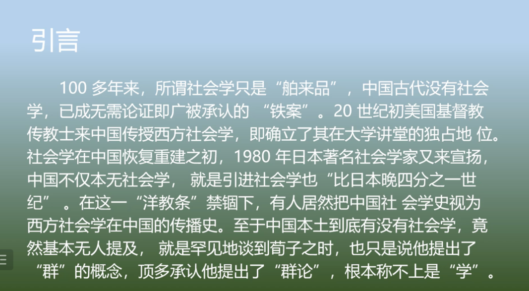 什么是中国社会学的“根本”?中国社会学只个“舶来品”吗?这一直以来都是社会学家争论的热点,景天魁研究员引经据典,从古籍记载、古文描述中寻找答案,从近代各名家的观点展开论述,最终确定荀子的群学为中国社会学话语体系的第一个版本,并提出了群学的合群、能群、善群、乐群四层命题。