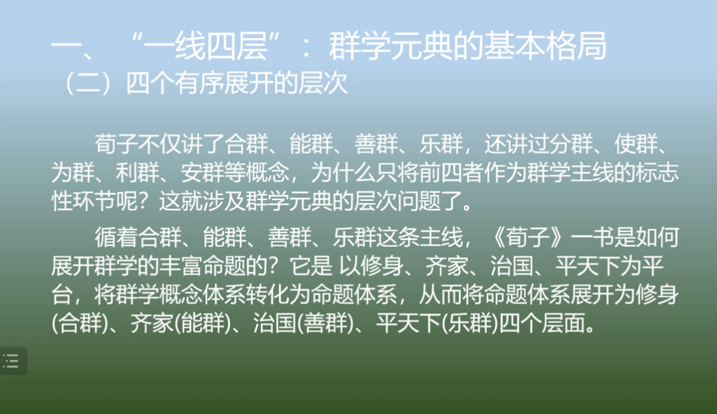 在群学命题体系的原本结构之上,景天魁研究员进一步说明群学的命题体系更具有自身的演进逻辑。其演进的奥妙首先在于“整合”。群学命题体系的演进逻辑,不是分析的、区隔的、非此即彼的区隔-分析逻辑。如梁启超在讲到王阳明的“知行合一”时说,中国人什么都讲“合一”,追求的就是“合一”,“知行原是一个字说两个工夫”,知是(为)行的知,行是有知之行,本是“一物”,或谓“知行本为一事”、“心与物合一”、“心与理合一”。知之于行、义之于利、道之于功,在西方的“区隔分析逻辑”中,是要把二者的界限分得越清楚越好,甚至为了分得清楚,不惜把二者对立起来,而在中国传统思维中,二者不过是“本一物而二名”。其次,群学也是贯通的,荀子特别强调“解蔽”,“蔽”则塞,“蔽”则障,去蔽则通。最后,景天魁研究员指出群学的命题体系更以合群、能群、善群、乐群为主线,呈现为依次递进、层层包含和提升的关系(前者是后者的前提);同时又是逆序递归的——后者依次包含前者并且是前者的提升。每个环节都不是相互独立和断裂的阶段。如“修身、齐家、治国、平天下”就包含这种浓厚的递进又逆序递归色彩。