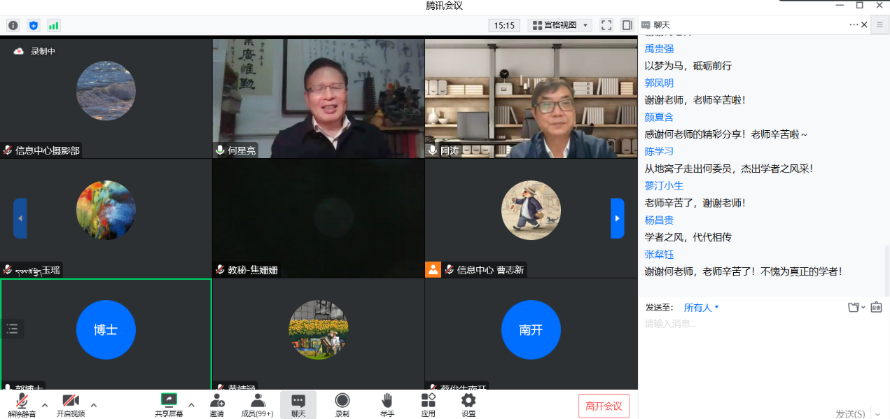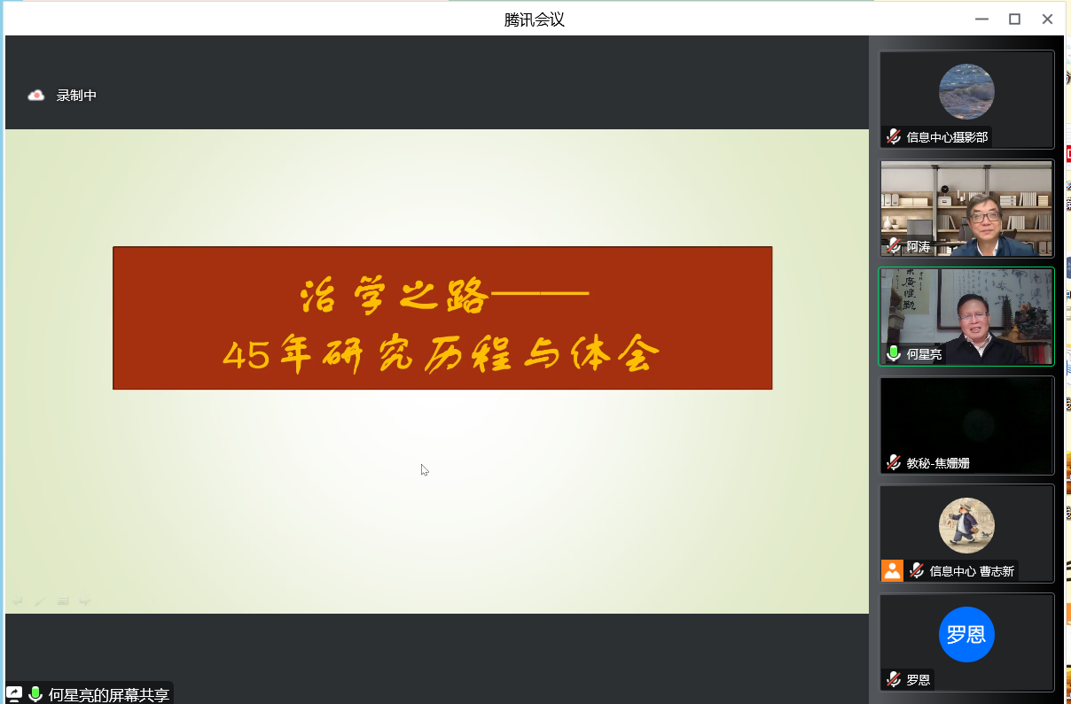 何老师总结自己的治学特点,表示自己走的是“从树木到森林”“先专后通”的道路,在研究中学习,在研究中扩大知识面。边研究、边学习,科学处理好“专”与“通”或“专”与“博”的关系,既出了成果,又学习了新的知识,不断地扩大自己的研究领域;同时要注重基础研究与应用研究相结合、专题性研究与综合性研究相结合,在相互交织中不断丰富自己,在研究中注意历时性与共时性的结合,在广阔的时空尺度中思考问题,要注意论证的逻辑严密,学习多重证据相结合的方法,完善自己的论证与研究。