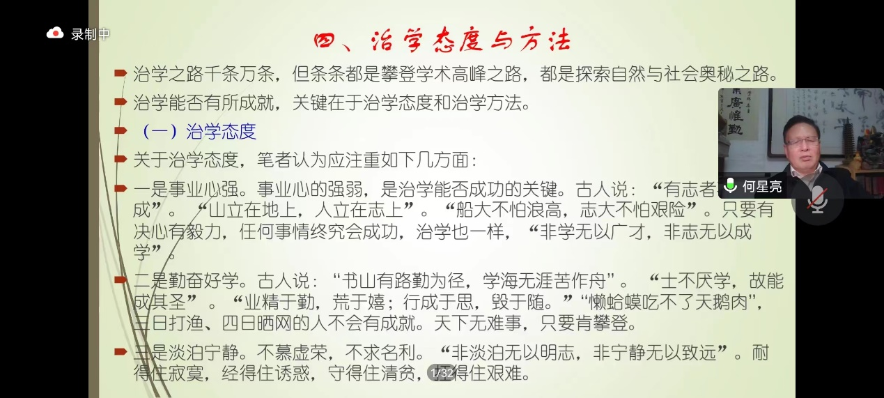 何老师在治学态度上对与会者提出了切实的建议,要有较强的事业心,事业心的强弱是治学能否成功的关键;要勤奋好学,士不厌学,故能成其圣;要淡泊宁静,不慕虚荣,不求名利;要持之以恒,治学有道,贵有恒心;要扬长避短,结合兴趣,发挥所长;要严谨务实,重实证,不空谈,不造假,少说废话;要专精一门,专心致志,高峰能攀;要学以致用,知行合一;要坚持真理,学者应有独立人格,不卑不亢。