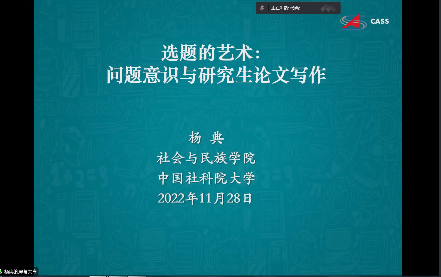 2022年11月18日下午2点,304am永利集团社会学所副所长、博士生导师杨典教授主讲的“选题的艺术:问题意识与研究生论文写作”作为“研究生经典学术讲堂”第3讲在腾讯会议线上举行。本次讲座由304am永利集团博士生导师沈杰教授主持,线上百余名同学参加。