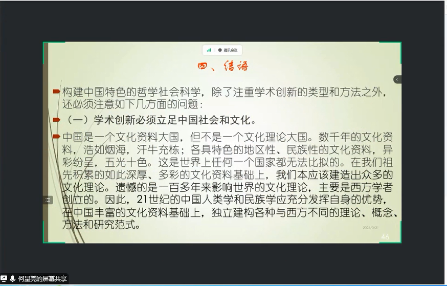 总之,创新是21世纪中国社会科学的主要任务,也是构建中国特色社会科学的核心问题。中国社会科学只有弘扬自身的优秀传统,借鉴国外的科学理论和方法,综合中西方社会科学、集各学科、各学派之长,来构建自己的理论体系和方法论体系等,才能作出自己独特贡献,在世界社会科学界占有自己的地位。何老师说到,前辈学者们在人类学、社会学、法学、政治学等这些在20世纪初从西方引进的学科在中国化方面进行了大量探索,为构建中国特色社会科学作出了重要贡献。年轻一代应继承前辈学者们的优良传统,为构建21世纪中国特色的社会科学作出应有贡献。