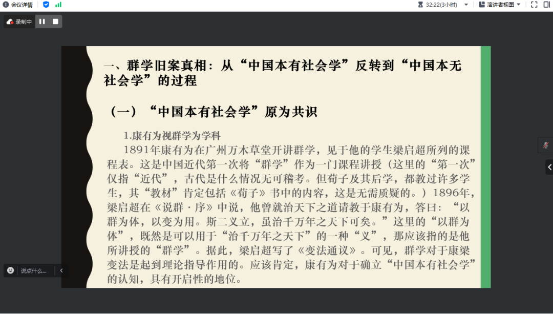 讲座伊始,景老师从“转型”一词切入中国近代社会,联想到中国近代社会所发生的变化与转型,群学当然也不例外。景老师指出,群学在向近代转型过程中,由于遭遇国运衰退以及西方社会学的强势传入等原因,“群学”之名逐渐被“社会学”之名所取代,由此引发出“中国本有社会学”和“中国本无社会学”的根本分歧。围绕这个根本分歧,景老师指出,“群学”之名被“社会学”之名所取代,到底是如何发生的?原因是什么?应该得出什么教训?景老师以这三个问题为引子开始今天的讲座。