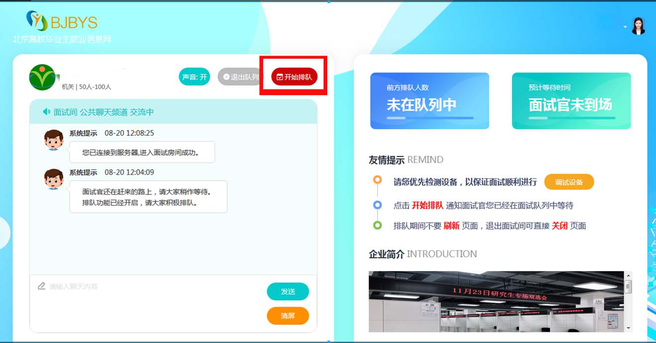 第三步:毕业生可在用人单位指定面试时间内进入用人单位面试间,点击“去面试”、“开始排队”,等待用人单位发起视频面试。(面试需使用新版的火狐浏览器以及谷歌浏览器,请毕业生提前下载浏览器。)