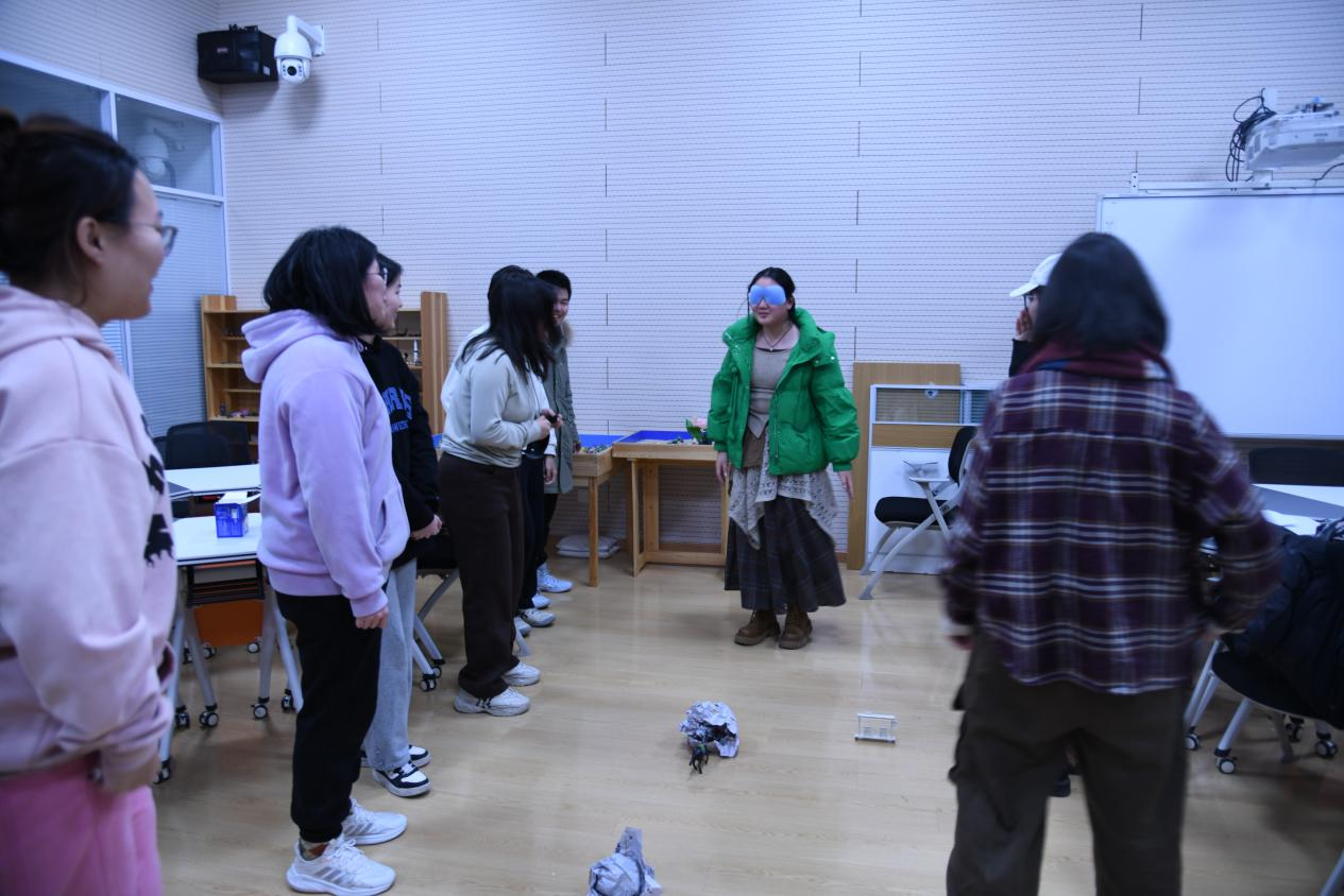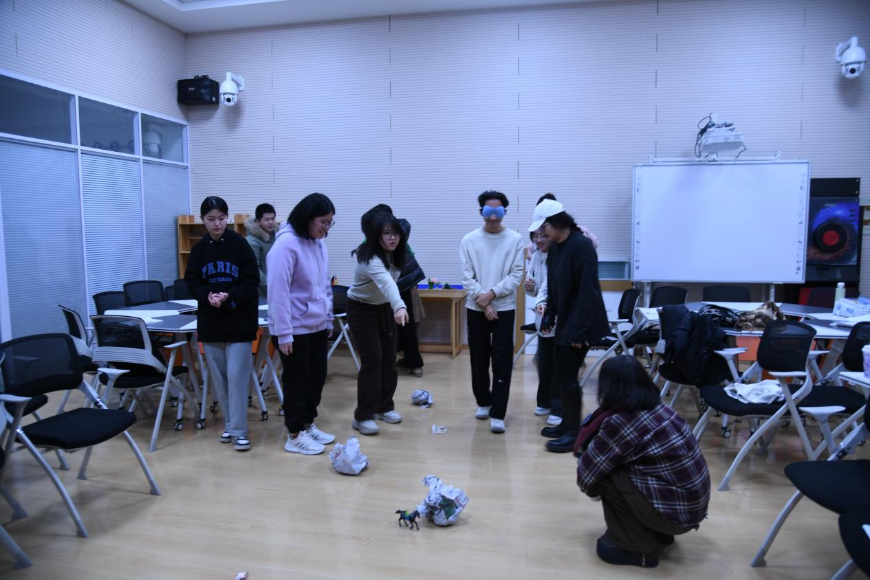 随后,进行地雷阵挑战。主持人将新生分为两组,游戏过程中,一名队员蒙住眼睛,队友在地雷阵外提示他方向。若碰到地雷,则扣一分;若捡起急救包,则加一分。两组队员争分夺秒,展开了一场智慧与体力的较量。最终,两组队员均顺利完成任务。这个环节让小组成员体验到了团队协作的重要性,增强了团队凝聚力