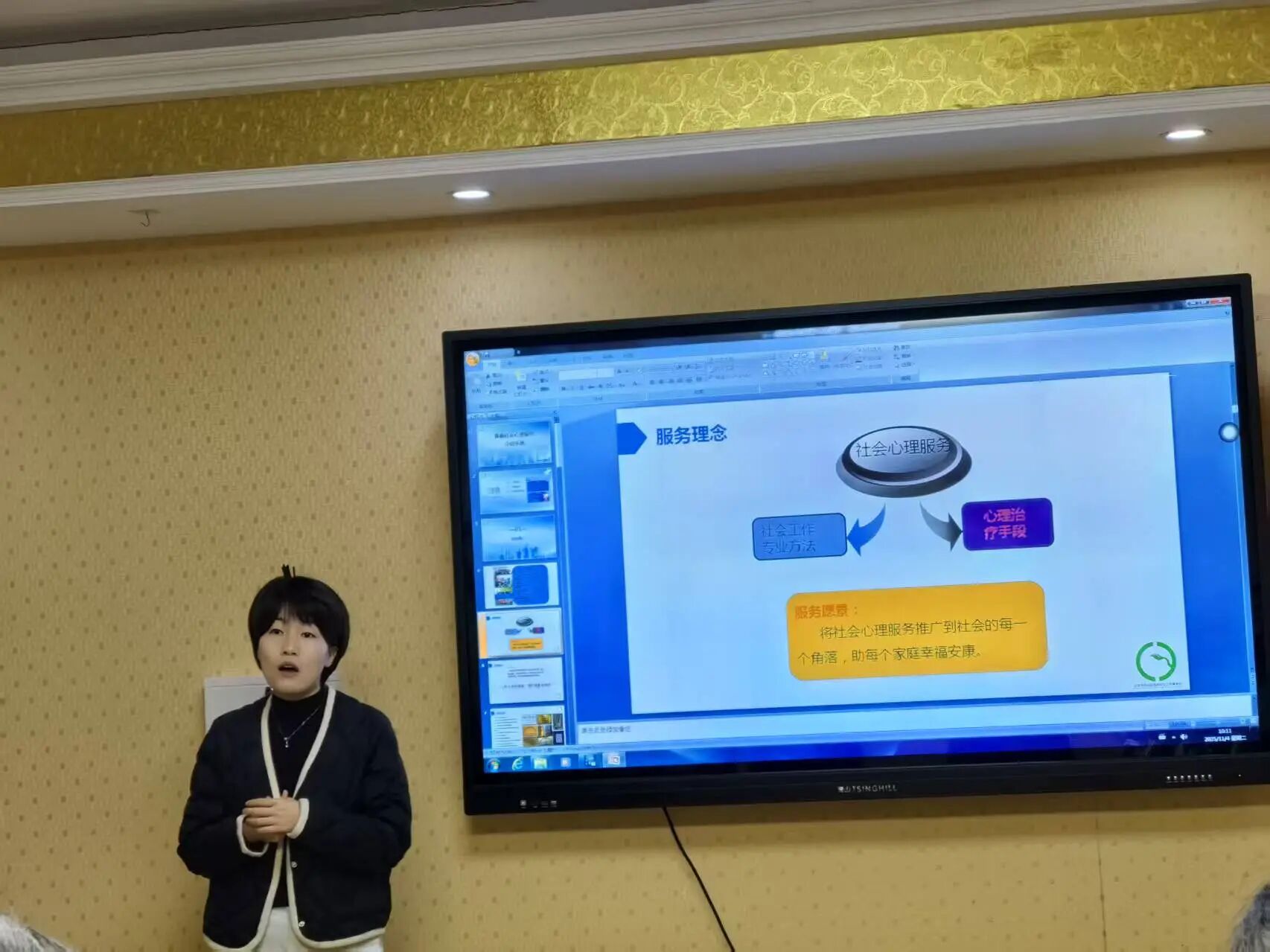 参观完成后,大家在会议室落座,由事务所所长班春燕进行机构介绍和案例讲解。她结合真实案例,重点介绍了事务所的三类核心服务:一是司法与学校社工,通过典型案例,说明社工如何通过绘画评估、心理疏导介入未成年人保护,并推动司法强制报告制度落地;在学校中开展性教育、临界预防小组,构建家校社联动机制。二是信访社工,通过邻里矛盾调解案例,阐释“三治三促”服务模式,即从心理需求切入,链接资源化解深层矛盾,将年拨打电话500余次的信访者转化为社区志愿者。三是婚姻调解:在婚姻登记处开展性格测试与沟通技巧培训,离婚调解以“冷静期”为契机,通过改善沟通而非简单劝和,实现90天内近100%调解成功率。