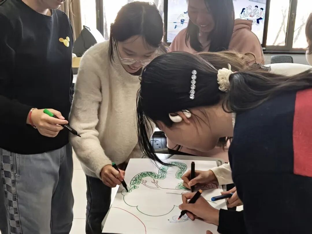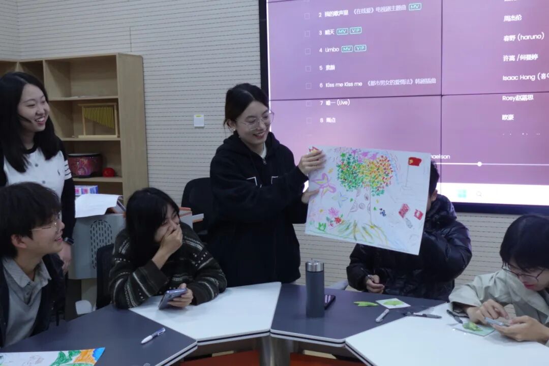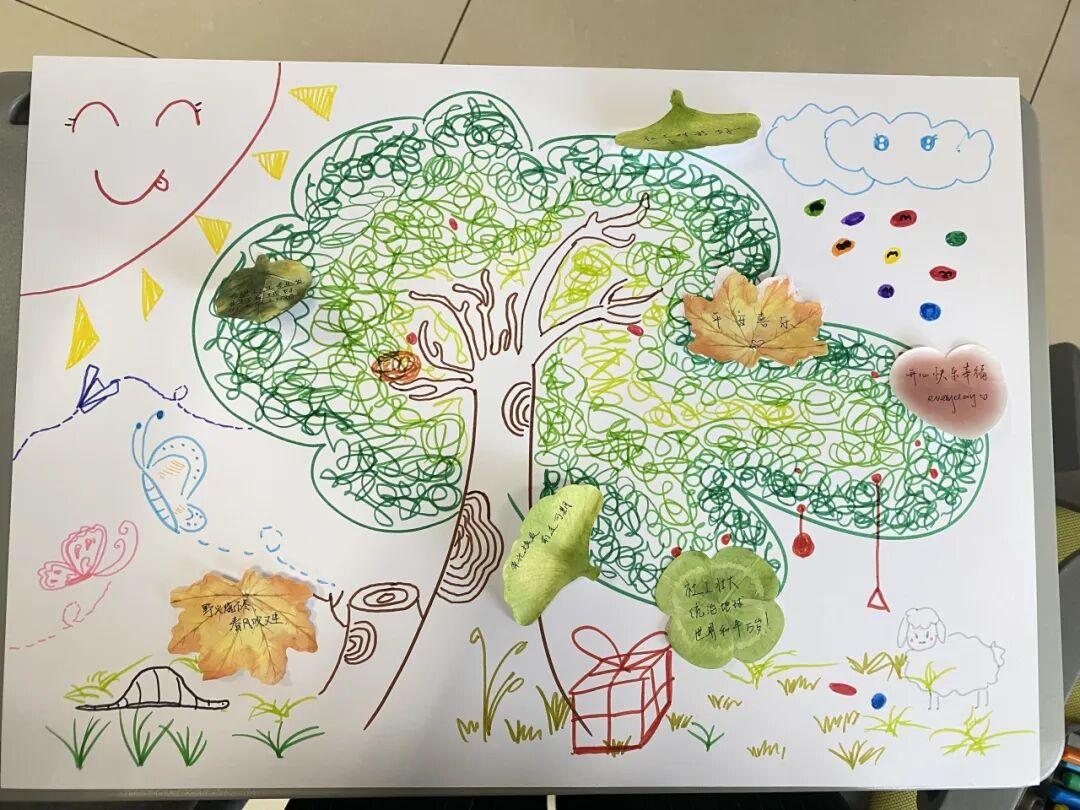 游戏过后,活动进入“共创愿景——希冀园”环节。社工拿出准备好的大白纸和彩笔,邀请组员共同创作集体画作,要求画作中必须包含一颗茁壮成长的大树,这棵大树象征集体与个人的共同成长。在舒缓的轻音乐中,大家轮流上前,尽情发挥想象力,添上代表梦想的太阳、象征友谊的花朵、心仪的校园一角等元素。创作完成后,多位组员分享了自己的作品及背后的深意,显著增强了小组的凝聚力。紧接着的“播种希望——希望的种子”环节,社工为每位组员发放彩色便利贴和中性笔,让大家写下在接下来的小组活动中最希望收获的成长或想要发生的小改变。同学们自愿挑选便利贴颜色,郑重地将“种子”粘贴在“希冀园”大树的周边区域,并逐一分享了自己的愿望,聆听中,社工给予了充分的共情与鼓励。