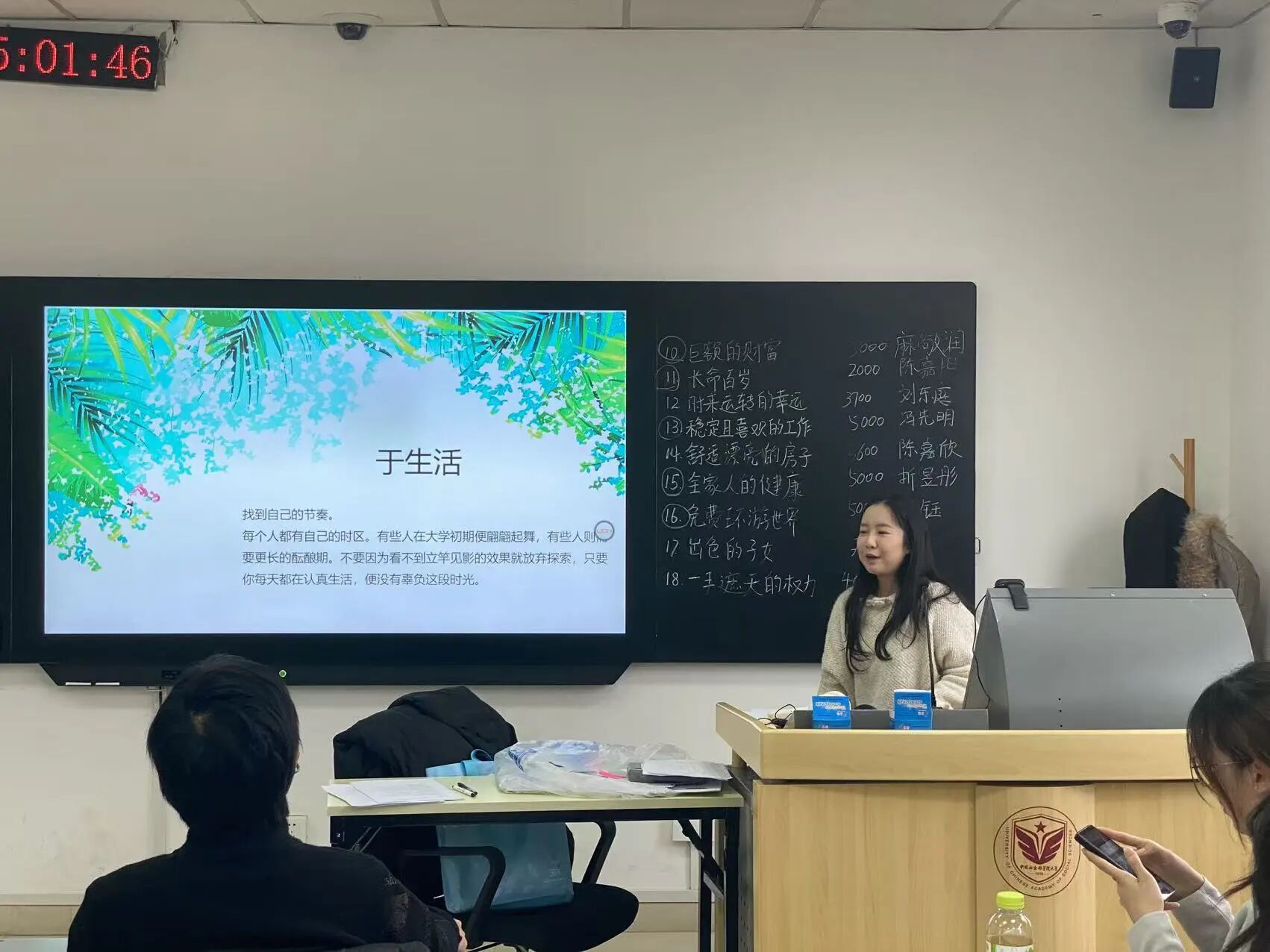 接下来,活动进入“高中与大学学习生活对比分享”环节。大家首先观看了一段“我们的高中生活”回顾短片,唤起大家的共同记忆,规律的作息、紧密的课程安排与明确的目标。接着,新生们结合入校以来的真实体验,分享了高中与老员工活的不同。一位同学说:“高中时每天都有老师带着走,现在要学会自己安排时间,一开始真的不习惯。”另一位同学则表示:“大学的课程内容更多样,需要主动去图书馆、找资料,感觉更有挑战,也更有意思。”分享现场气氛活跃,主持人也在互动中鼓励大家主动适应变化,找到自己的节奏。