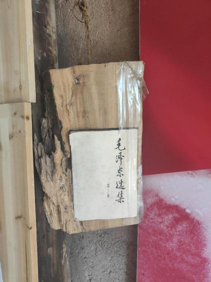 张老师说,很多材料现在都还在探索。在爱故乡书院进门的地方,有几块关于马克思主义、毛泽东思想和中国特色社会主义思想的展板。张老师说,展板最初是交给广告公司做的,呈现出来的是钉在墙上的泡沫板,看起来十分突兀。后来自己探索,把柴火中间挖空,然后把《毛泽东选集》、《习近平用典》等书籍嵌到柴火当中,悬挂起来。这样既能体现乡土风味,又可以避免破坏墙体。