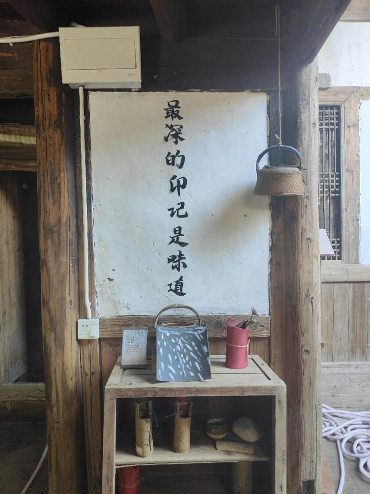 他介绍的第一处布景是初心楼后门正对着的一面墙。地上有个小架子,上面摆了收集到的乡村旧物,比如说烧水用的炉子。墙上贴着“最深的印记是味道”这几个字,这些字是残缺的,每个字都少了一两个笔画。张老师说,正是因为收集到了当地的炉子,才激发了做这个布景的灵感。“最深的印记是味道”这几个字,有些笔画掉了,大家都觉得要补,他认为就不补,因为味道煮起来都是一样的,可是每个人品尝的都不一样,同一道菜不同人吃,有的人觉得咸了,有的人觉得淡了,有的人可能还有别的感受。这种印记是说不清道不明的,需要孩子们去想象和创造。老师们可能教不了孩子很多的东西,但是这样的环境可以默默影响他们。