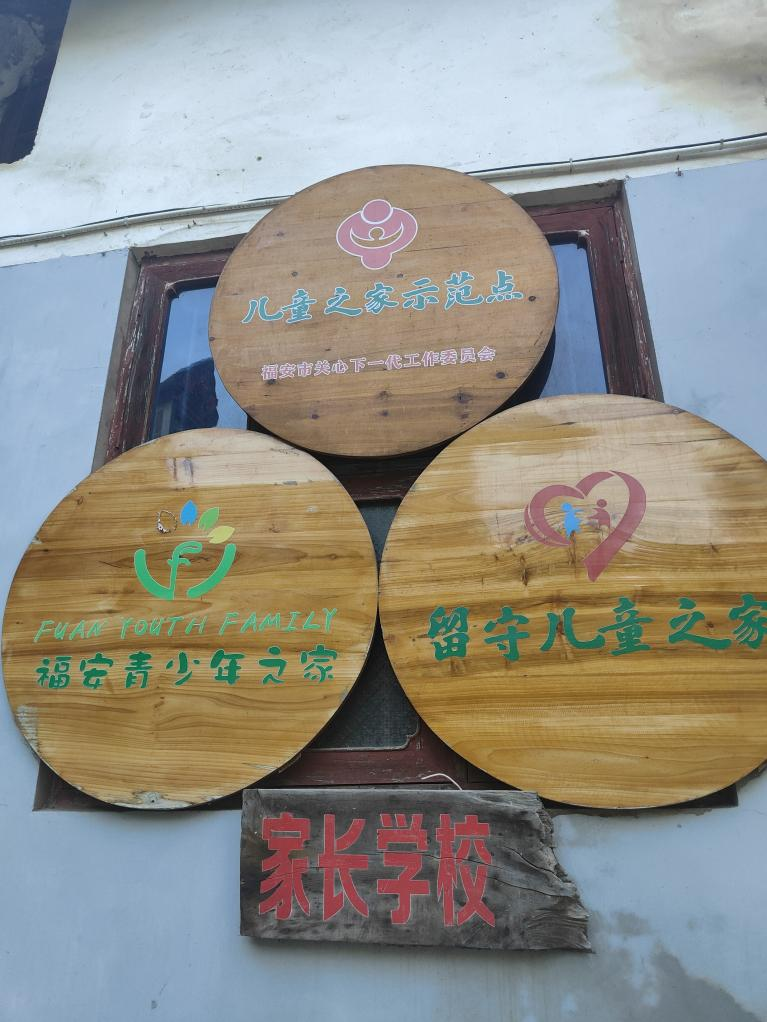 接着,我们从初心楼向爱故乡书院的方向走。两座宅子之间的墙面上,挂着爱故乡书院的时间表和“儿童之家示范点”、“福安青少年之家”、“留守儿童之家”以及“家长学校”这四个牌匾,这些牌匾看起来平平无奇,但背后却隐藏着设计者的用心。张老师说,农村里做饭经常要烧柴火,大家对于柴火、木头比较熟悉和亲切。“家长学校”这块牌匾就是用做柴火的木头做的。另外的三个圆形牌匾,取材于吃饭用的圆形桌板,也是木质的。我上前仔细一看,果然是农村中摆宴设席时用的圆桌桌板,上面的木质纹路十分清晰。